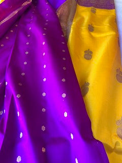 Pure Katan Banarasi Saree Purple and Mustard Yellow Color SILK MARK CERTIFITED